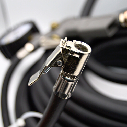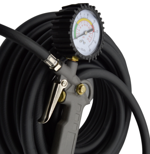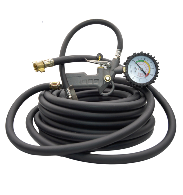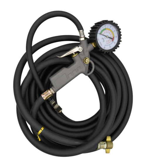 Acest furtun pentru umflat roti este dotat cu manometru.