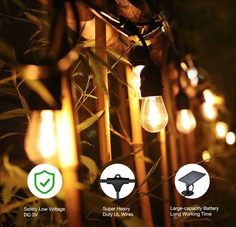 Ghirlanda solara cu LED perfecta pentru gradini, terase sau balcoane. Becurile cu filament va permit sa iluminati gradina seara si sa petreceti serile lungi de vara afara cu prietenii si familia, in timp ce bateria incorporata si panoul solar va permit sa va bucurati de lumina serii fara a fi nevoie sa conectati dispozitivul la sistemul electric.