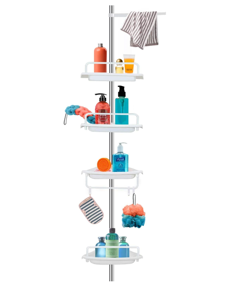 Acest raft pentru baie este foarte practic si incapator, accesoriile de baie fiind intotdeauna la indemana dumneavoastra. Raftul este prevazut cu 4 nivele pentru sampon, gel de dus si accesorii pentru baie, un suport pentru prosoape si 3 carlige pentru burete sau alte accesorii.