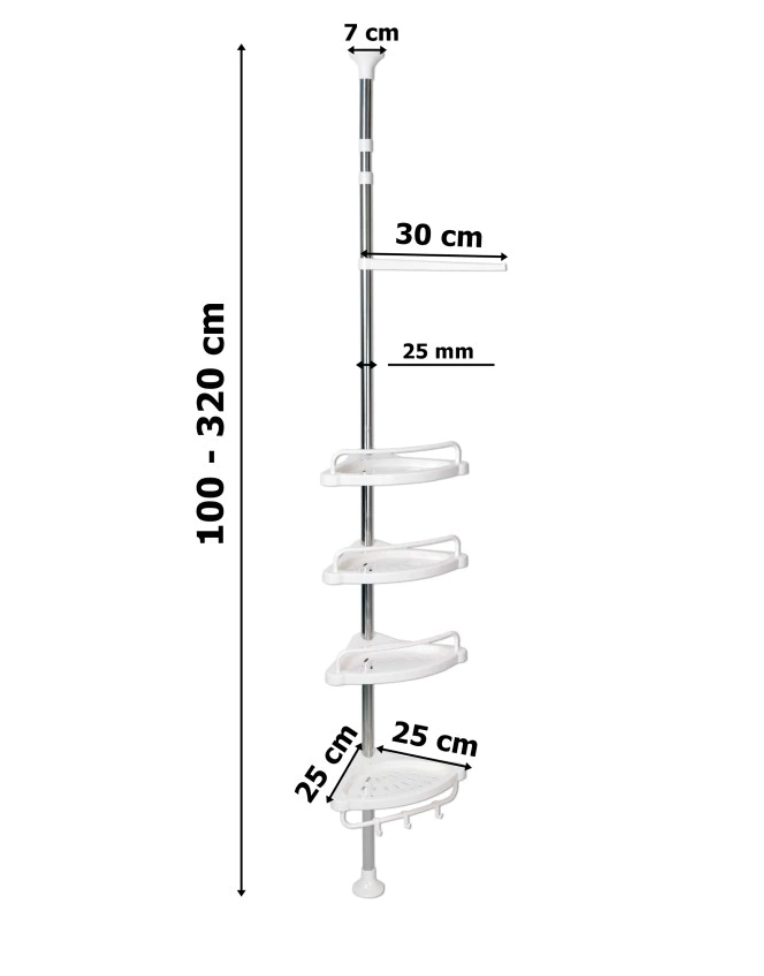 Inaltimea suportului si distanta dintre rafturi sunt reglabile in functie de preferinte. Acest raft este potrivit pentru a fi montat in coltul unei cazi sau a unei cabine de dus. Raftul este foarte usor de montat si demontat fara a fi nevoie de accesorii suplimentare pentru montarea acestuia.