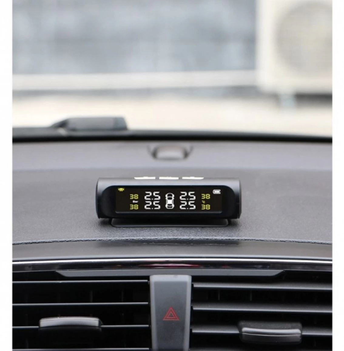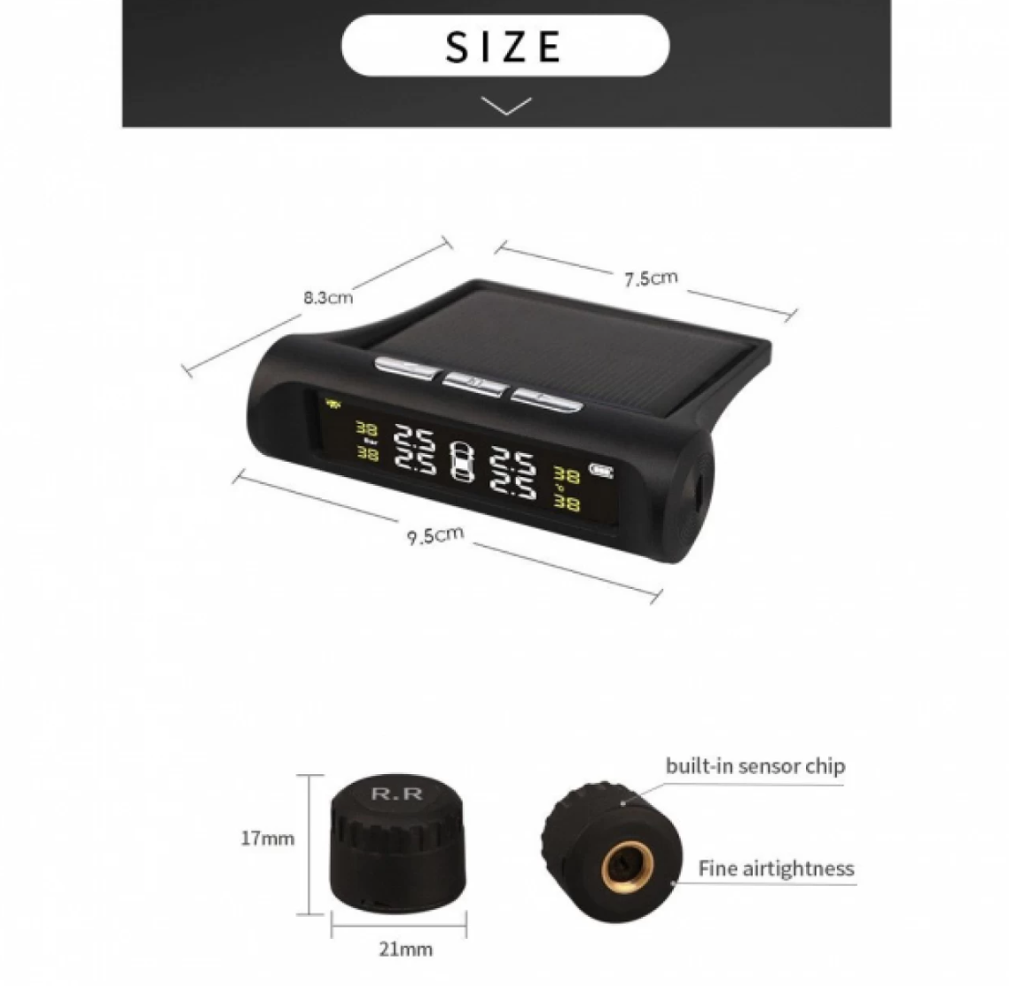 Sistem de monitorizare a presiunii în pneuri 0-8 Bar 0-99 PSI. Foarte ușor de instalat, durează câteva secunde. Se poate instala pe orice tip de autoturism chiar și pe TIR. Cip infineon - Germania ! Produsul conține baterie internă, se poate încărca cu cablu mini USB (neinclus) sau solar daca se lipește pe parbriz. Prima încărcare trebuie făcută cu cablul USB.