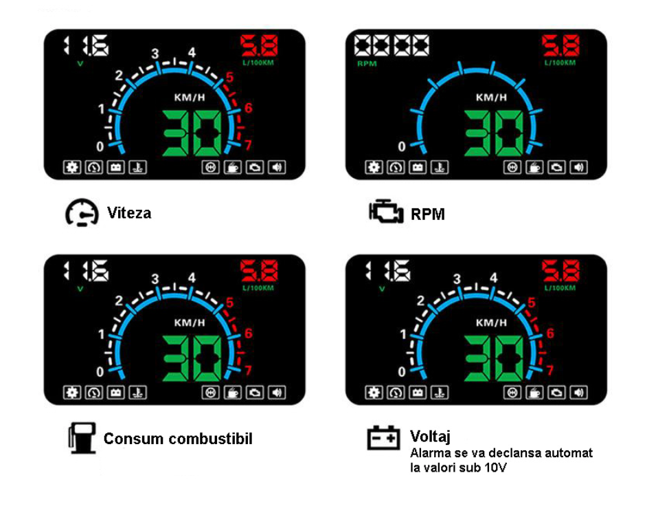 Dispozitivul poate fi utilizat si ca sistem de diagnosticare fiind potrivit pentru condusul pe timp zi sau de noapte deoarece afiseaza informatiile importante cum ar fi viteza, consumul de combustibil, temperatura apei.