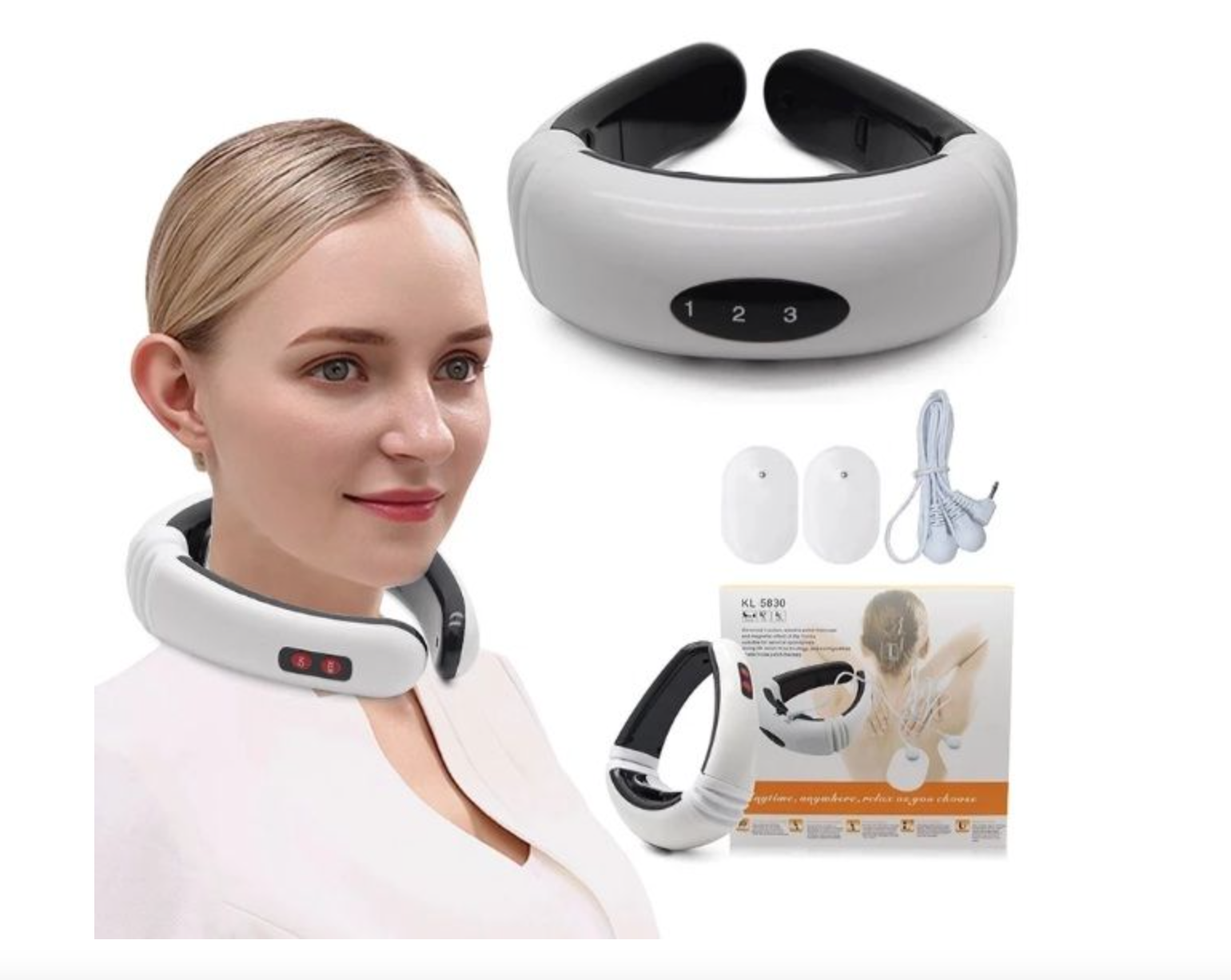 Aparatul KL-5830 vine cu un design modern si simplu, si poate fi usor de purtat chiar si la birou in timpul serviciului, lucrand asupra zonei cervicale cu o tehnologie de laminare 3D prin pulsuri electrice, care pun in circulatie sangele, relaxeaza muschii si maseaza prin electrovibratii zona respectiva. Dispune de 2 electromagneti amplasati in zona cervicala si de 2 plasturi cu conectare directa la aparat, creati pentru a fi amplasati oriunde pe corp, lucrand si remediind zona prin pulsuri cu electrostimulare.