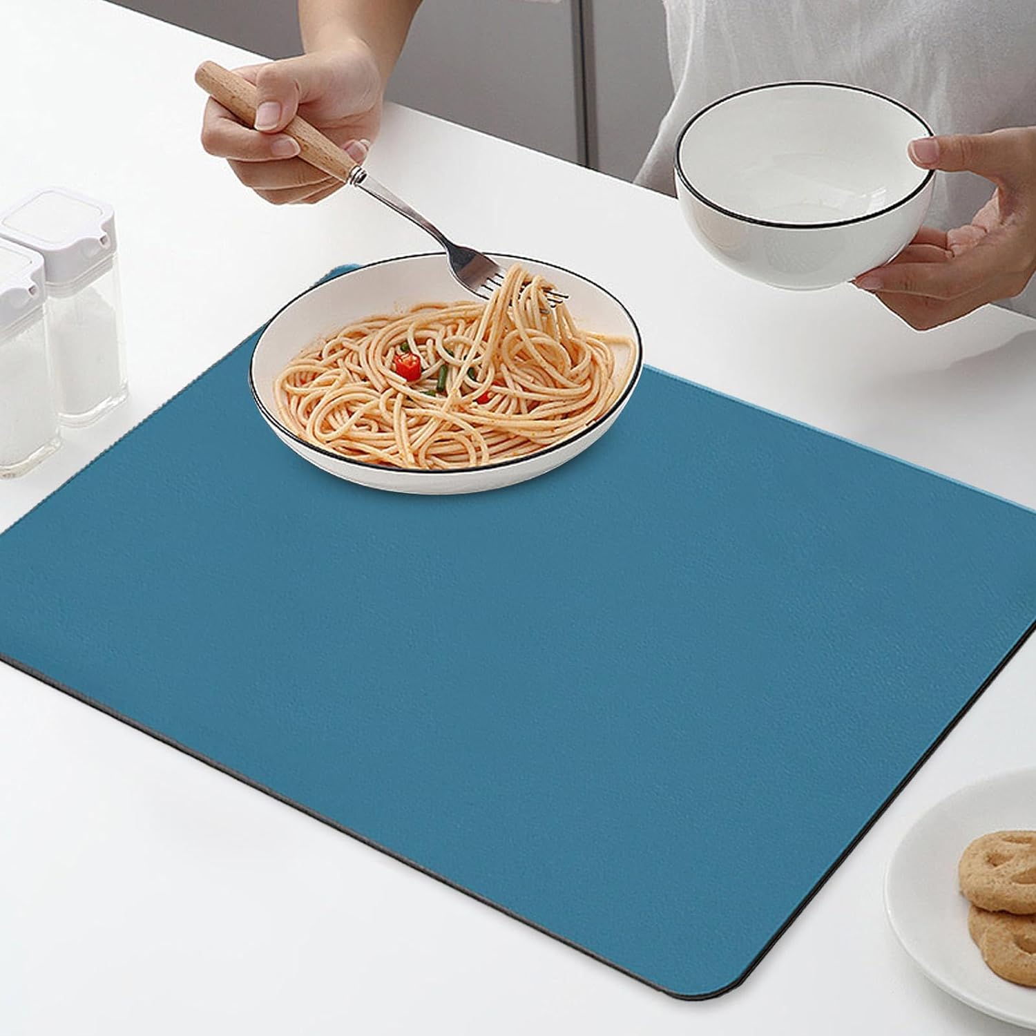 Scurgere pentru vesela si tacamuri: Covorasul este proiectat cu o zona speciala cu textura sau design care permite scurgerea apei de pe vesela si tacamuri, mentinandu-le astfel uscate si prevenind acumularea de umezeala.