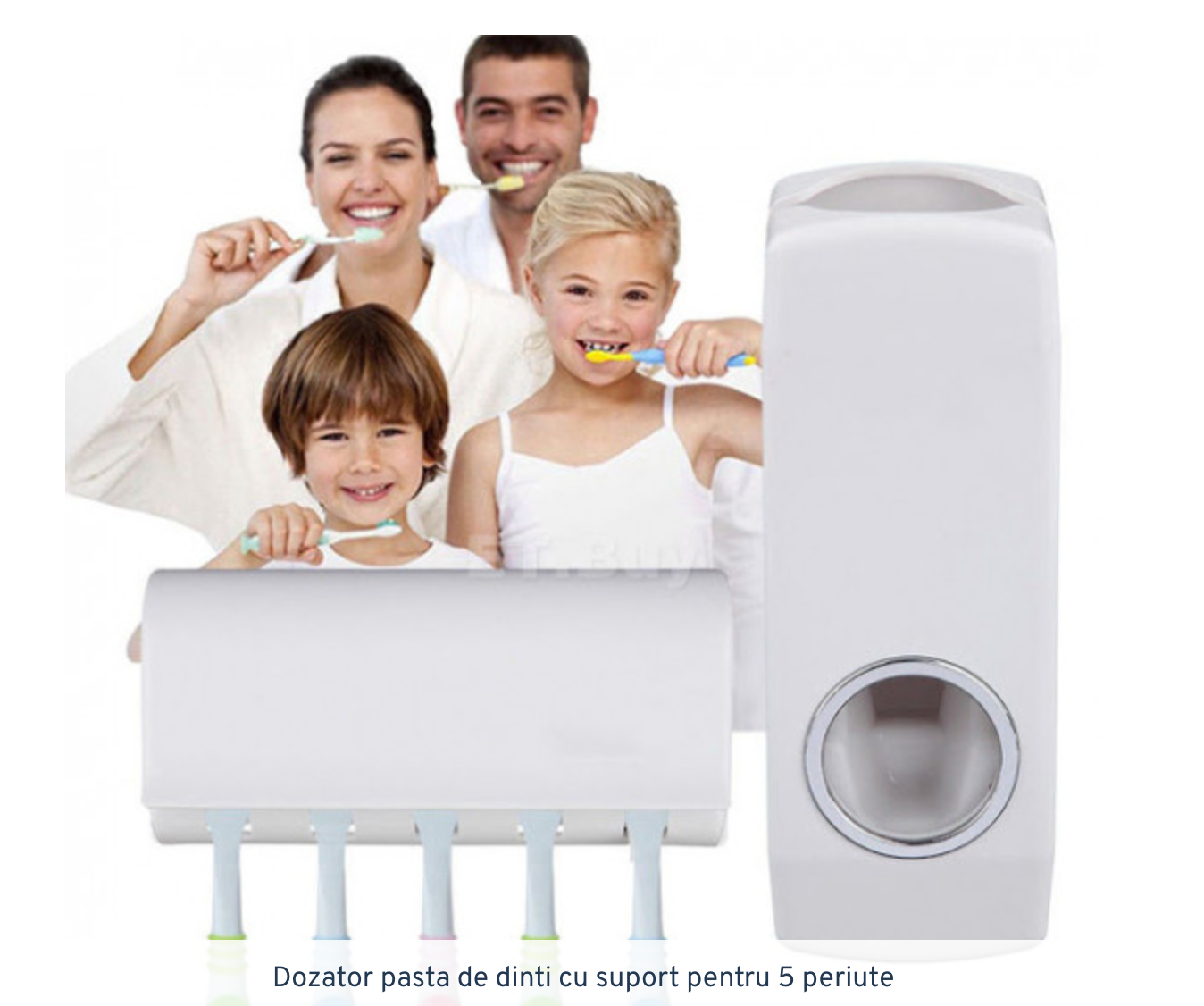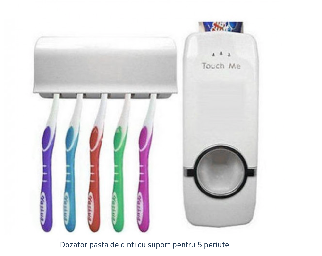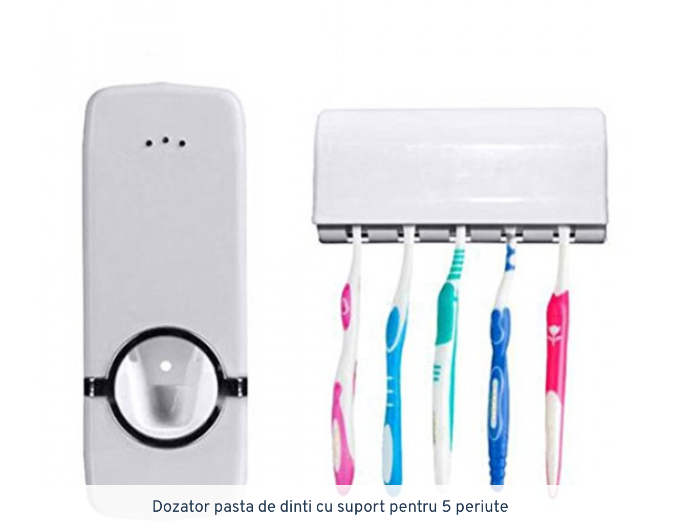 Tot ce trebuie sa faceti este sa introduceti periuta de dinti in locul special amenajat si sa impingeti usor, iar dozatorul va elibera o cantitate prestabilita de pasta de dinti. Pachetul include si un suport de perete pentru 5 periute de dinti, cu capac pentru a proteja de praf periutele. Prinderea se face cu banda dublu adeziva inclusa.
