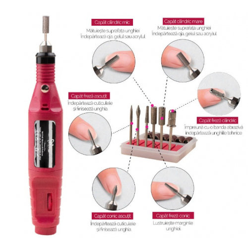 Freza electrica pentru unghii, semiprofesionala este ideala pentru manichiura si pedichiura! Freza electrica pentru unghii este foarte usoara, usor de utilizat in orice pozitie, avand viteza de rotatie variabila, intre 300 - 2000 RPM. Pila electrica pentru unghii este prevazuta cu mandrina metalica pentru fixarea capatului de lucru. Kitul se livreaza cu set de 6 capete de schimb si adaptor.