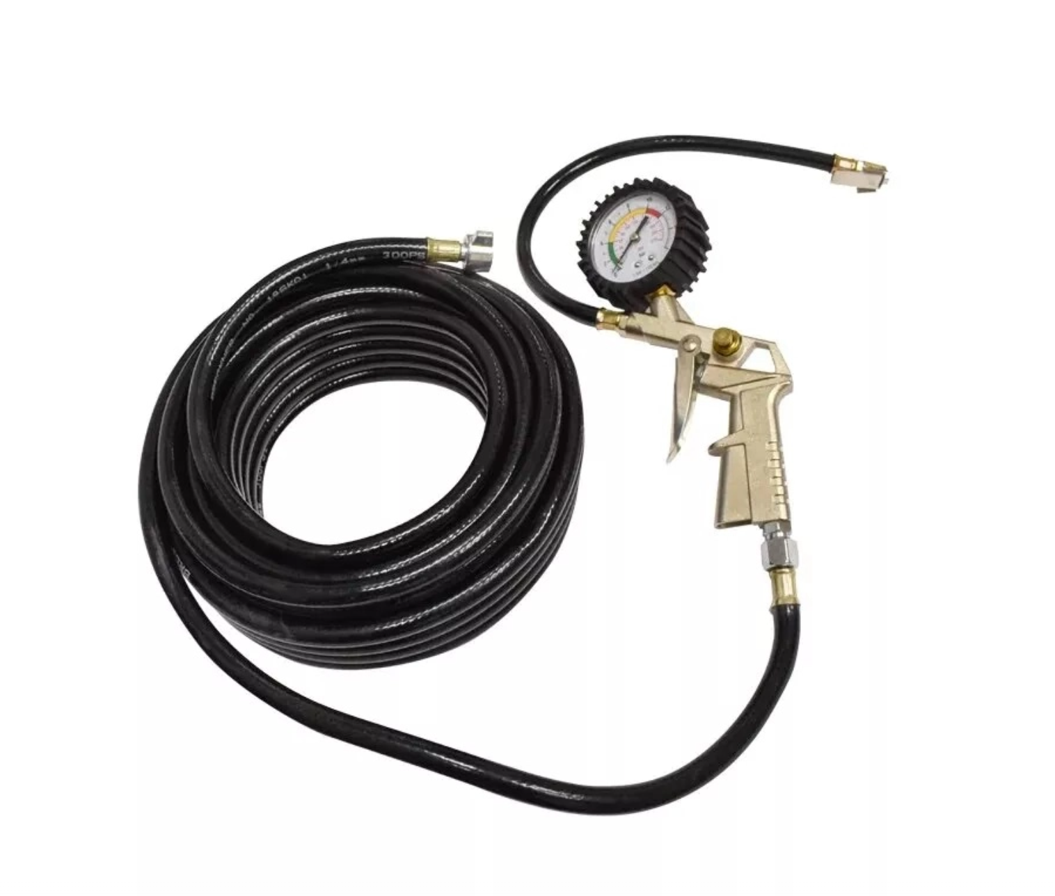 Acest furtun pentru umflat roti este dotat cu un pistol de tip manometru care va va usura munca.