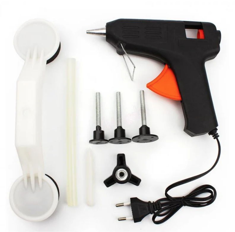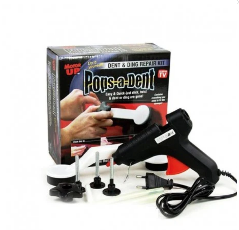 Kit pentru indreptarea tableiPops-a-Dent Puteti indrepta tabla masinii dumneavoastra rapid cu ajutorul kituluiPops-a-Dent, Kitul pentru indreptat tabla este foarte usor de utilizat, se aplica adeziv pe ventuza, fixati manerul curbat pe tabla apoi se trage fara a exista alte daune, Indeparteaza cu usurintaurme de lovituri cauzate de grindina, de pe portierele lovite de stalpi sau de carucioarele de cumparaturi si asta fara a deteriora suprafata masinii tale, Pops-a-Dentnu lasa urme pe croserie dupa ce a fost folosit, Caracteristici: - pistol cald pentru adeziv 220V, 40W -2 batoane de adeziv - mnerul curbat pentru ndreptat caroserii - ventuze cu diametrul de 5 cm