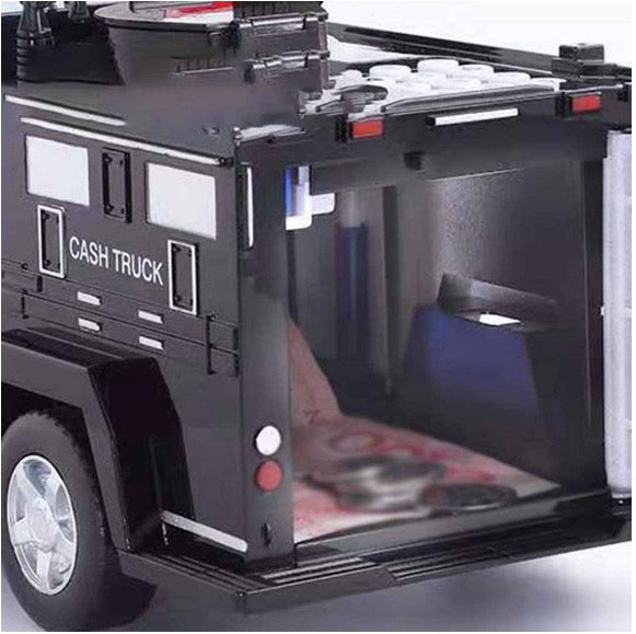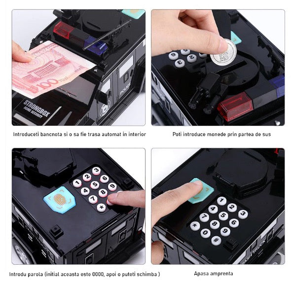 Incurajati copiii sa-si dezvolte obiceiul de a economisi si sa cunoasca valoarea banilor. Aceasta pusculita are forma unei masini blindate de politie, in care toate monedele si bancnotele vor fi protejate prin parola de siguranta (parola implicita 0000).