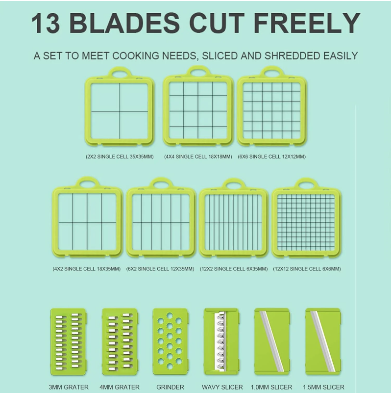 13 LAME DIFERITE: Tocatorul de legume vine cu 13 dimensiuni diferite de lame de taiere, conținand 7 dimensiuni diferite de lame de taiere si 6 lame interschimbabile, care va pot oferi numeroase opțiuni pentru taiere si faramițare. Tocatorul nostru de legume face usor sa taiați, feliați, taiați cuburi, tocați si zdrobiți.