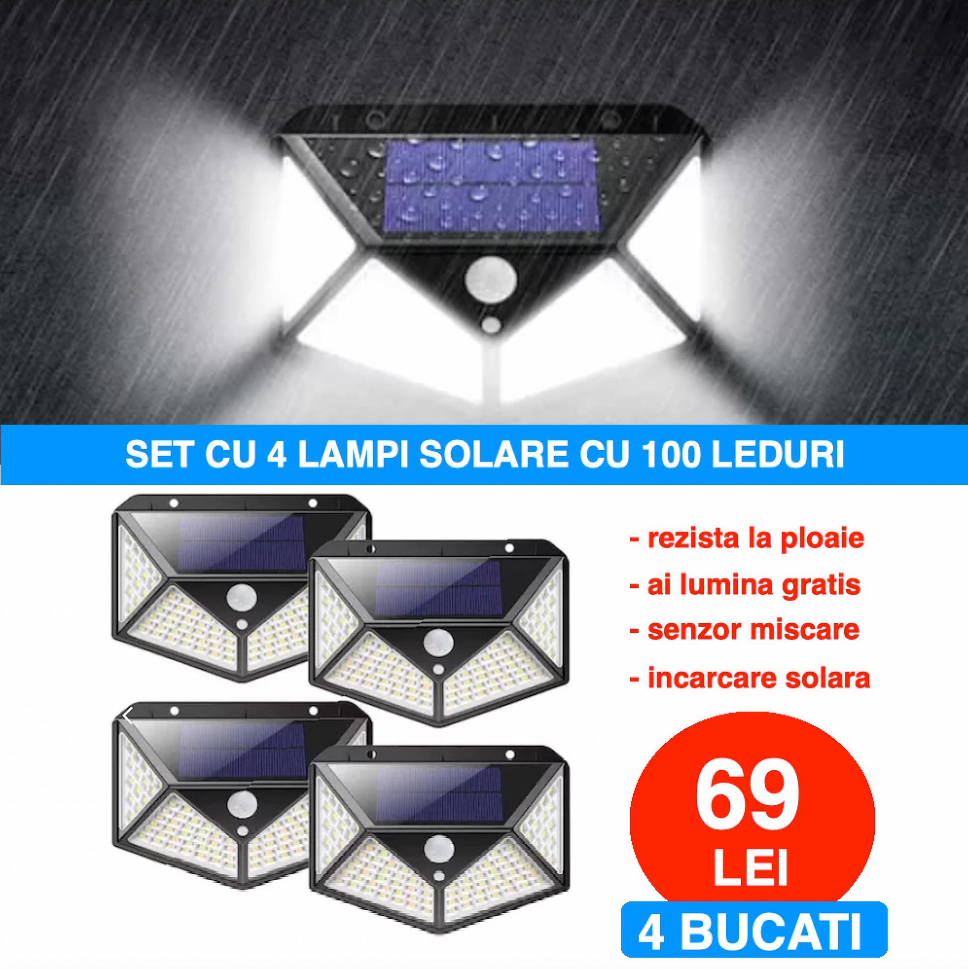 Set 4 Lampi Solare 100 LED UltraBRIGHT cu kit de prindere CADOU