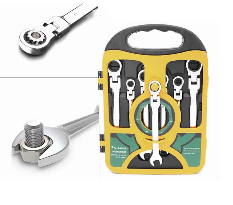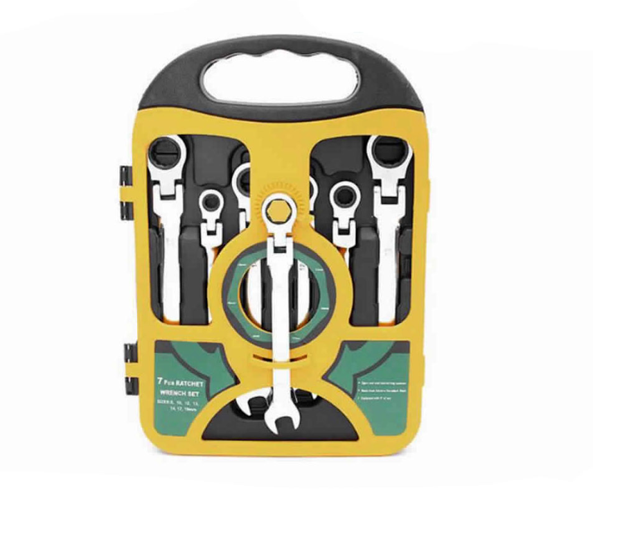 Setul detine 7 chei combinate, un capat fix, iar celalalt inelar cu clichet si articulatie, ideale pentru bolturi, suruburi si piulite hexagonale. Piesele vin prezentate intr-o trusa din plastic, ceea ce le face usor de depozitat si de pastrat intr-o maniera ordonata. Cheile sunt confectionate din crom-vanadiu si placate fin cu crom pentru prevenirea ruginei.