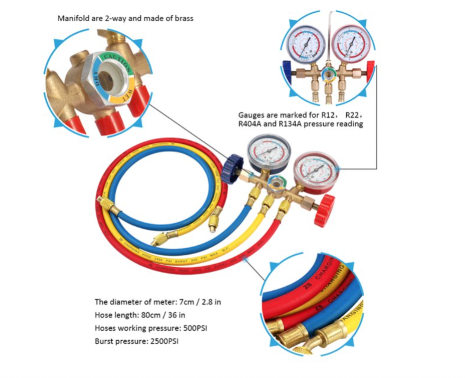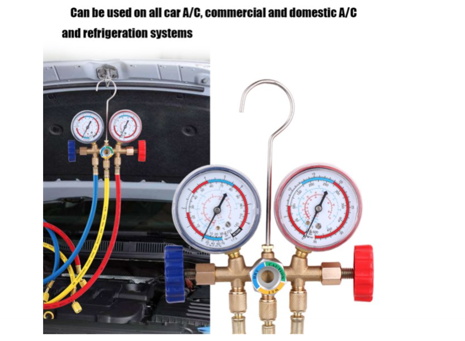 Acest set manometru cu 2 căi este folosit pentru încărcarea și verificarea sistemelor de aer condiționat, prin furnizarea valorilor presiunii.