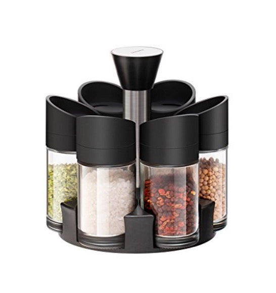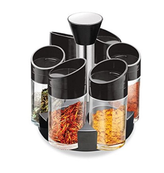 Este unul dintre cele mai utile accesorii din bucatarie, astfel iti vei putea organiza condimentele in fiecare recipient si le vei putea tine intr-un singur loc sigur si vizibil. Combinatia dintre suportul rotativ elegant si cele 6 recipiente transparente este ideal, astfel iti vei putea alege condimentul preferat imediat. Puteti lipi etichete cu denumiri, insa materialul transparent este ideal pentru a vedea imediat condimentul necesar.