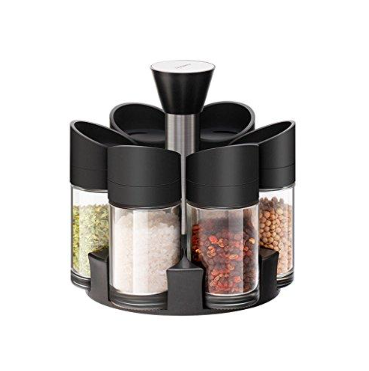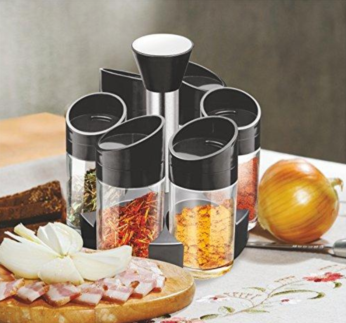 Este unul dintre cele mai utile accesorii din bucatarie, astfel iti vei putea organiza condimentele in fiecare recipient si le vei putea tine intr-un singur loc sigur si vizibil. Combinatia dintre suportul rotativ elegant si cele 6 recipiente transparente este ideal, astfel iti vei putea alege condimentul preferat imediat. Puteti lipi etichete cu denumiri, insa materialul transparent este ideal pentru a vedea imediat condimentul necesar.